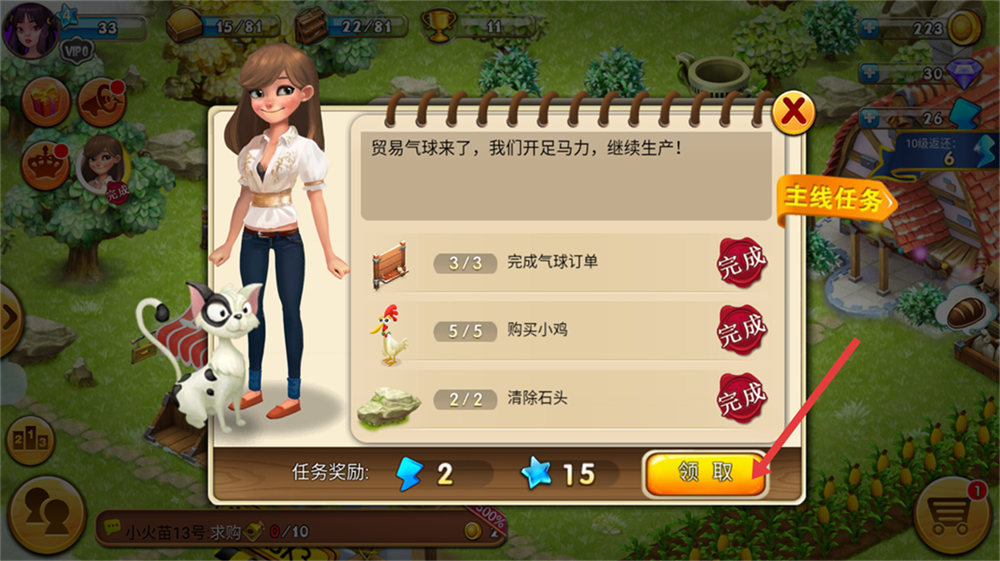 4、完成主线任务后点击【领取】,获取【蓝钻】和【星星】,发展快人一步呀。
