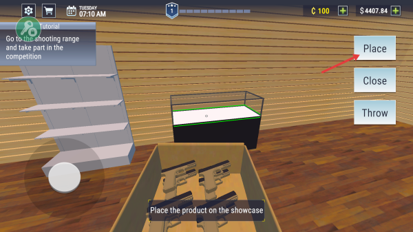 2、点击【Place】将商品放置到展示柜,推进商店经营进程。