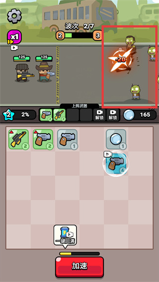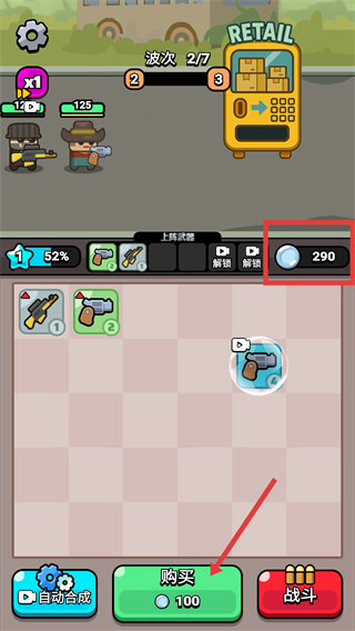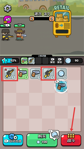 2、购买后获得新武器,将等级相同的武器(如方框内狙击枪)进行合成,获得更高等级后点击【战斗】按钮,进入波次战斗。