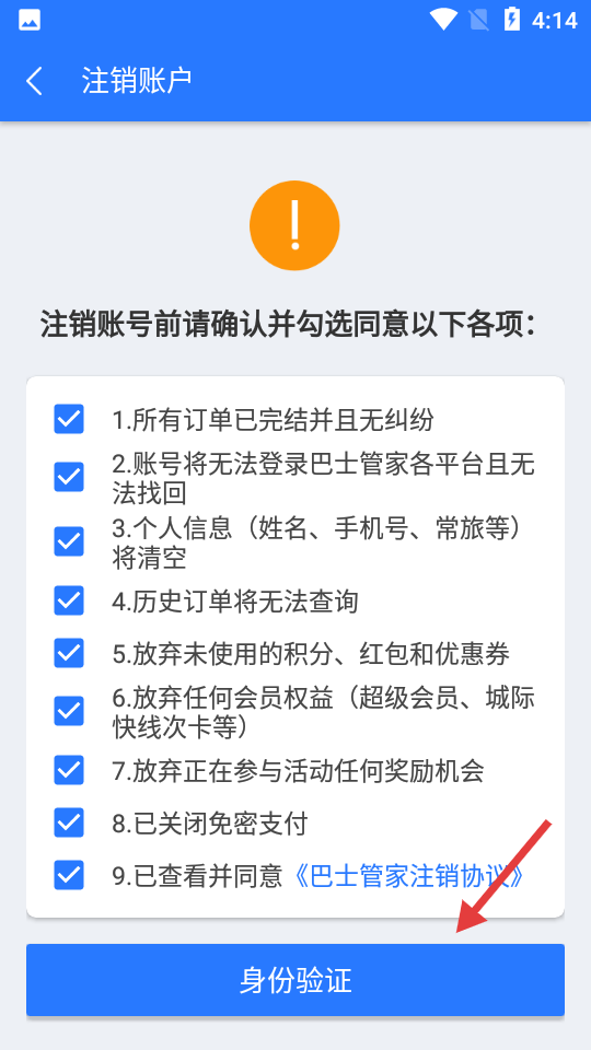 4、确认并勾选注销各项条款,点击【身份验证】,完成身份验证后,即可完成注销操作。