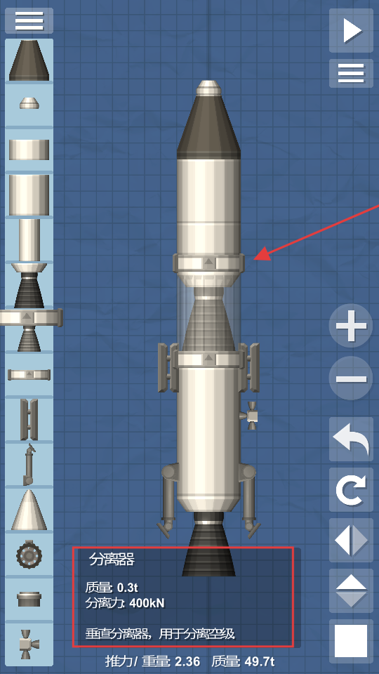 1、组装火箭时需选择合适的分离器部件,关注其【0.3t】质量与【400kN】分离力,确保能顺利分离空级推进飞行。