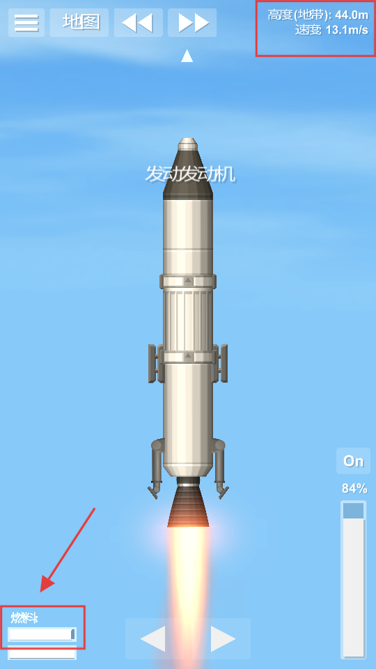 2、火箭发射初期实时关注【高度(地带)44.0m】和【速度13.1m/s】数值,保持燃料斗充足稳定上升。