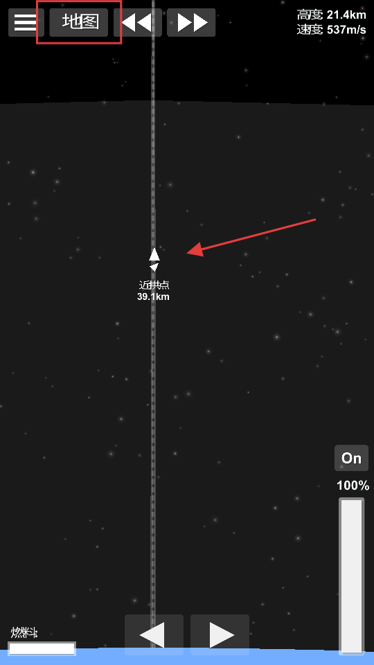 4、点击【地图】按钮查看轨道信息,关注【近地点39.1km】参数调整火箭轨迹,确保飞行符合任务需求。