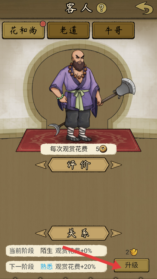 4、升级与客人的关系,从陌生到熟悉,调整观赏花费,提升客人互动的收益。