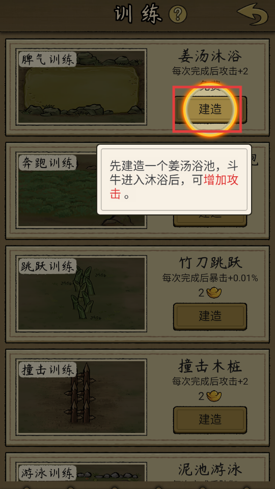 3、建造姜汤浴,斗牛进入沐浴后攻击提升,提升斗牛的战斗能力。