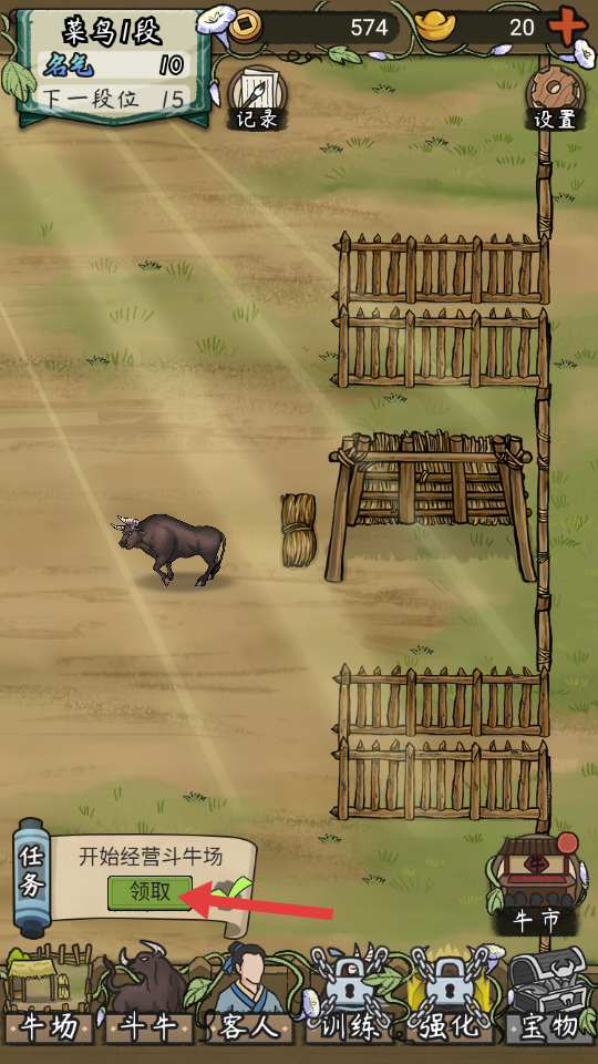 1、点击【领取】,开始经营斗牛场,开启游戏的经营流程,推进任务进度。