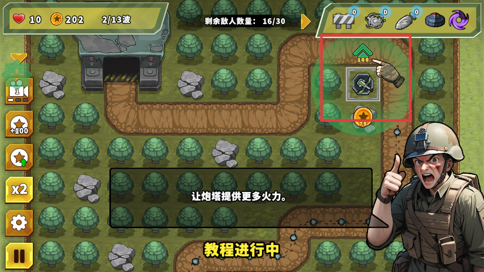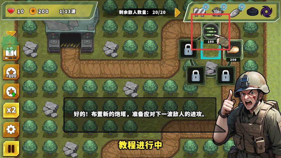 1、花费100资源布置新炮塔,准备应对下一波敌人的进攻,构建防御阵线。