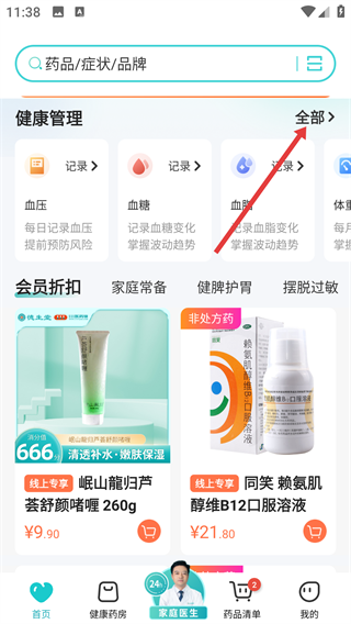 1、打开111医药馆软件,在首页点击【健康管理】旁的【全部】选项呢。