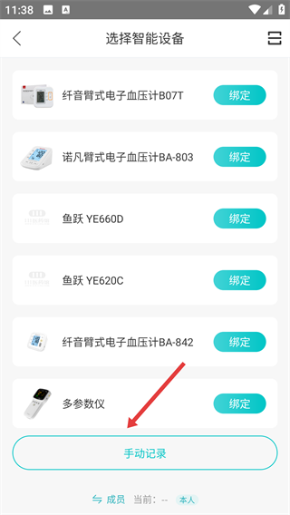 3、进入【选择智能设备】页面,我们可以绑定设备,也可以点击底部的【手动记录】选项啦。