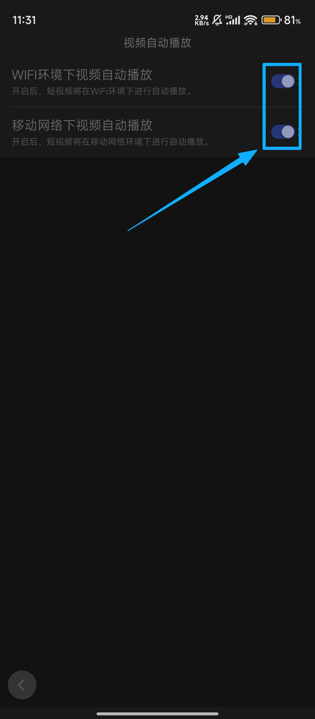 4、最后将【WIFI环境下视频自动播放】和【移动网络下视频自动播放】的开关关闭,就成功取消自动播放了呀。