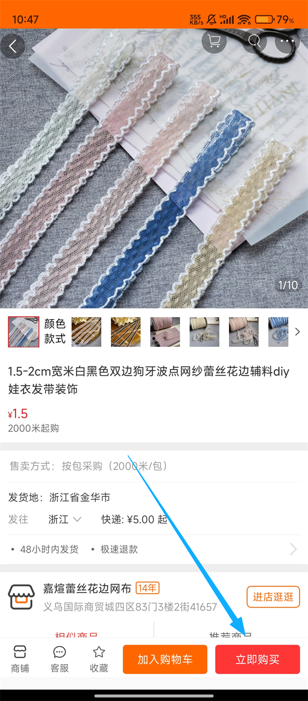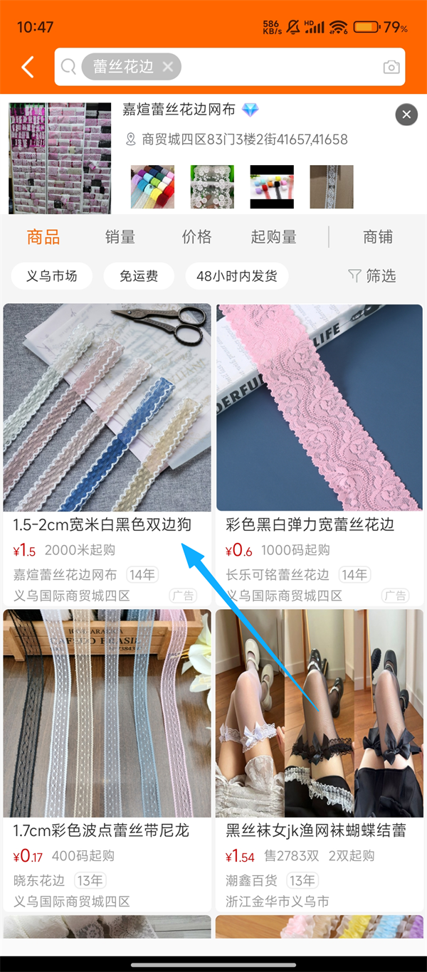2、之后点击【蕾丝花边】类别,从搜索结果中点击心仪商品,查看详细信息呀。