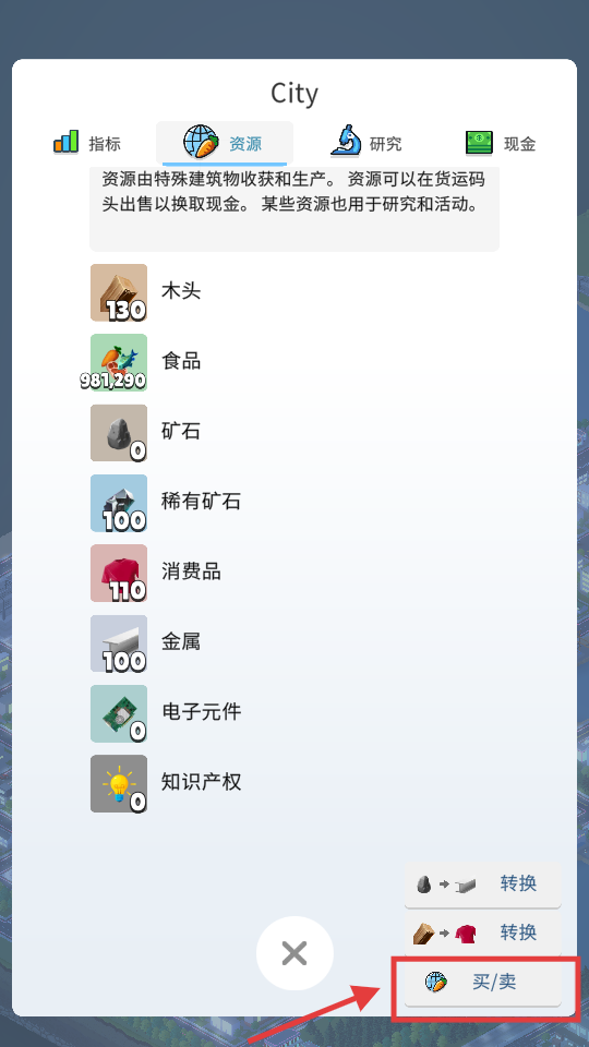 1、在【资源】界面点击【买/卖】按钮,可交易【木头】【食品】等资源,灵活调整库存平衡城市供需。