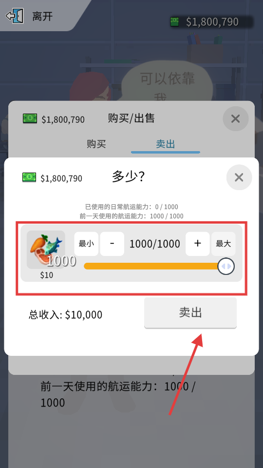 2、在买卖界面选择【食品】设置数量后点击【卖出】,快速获取现金支持城市后续的建设与发展。