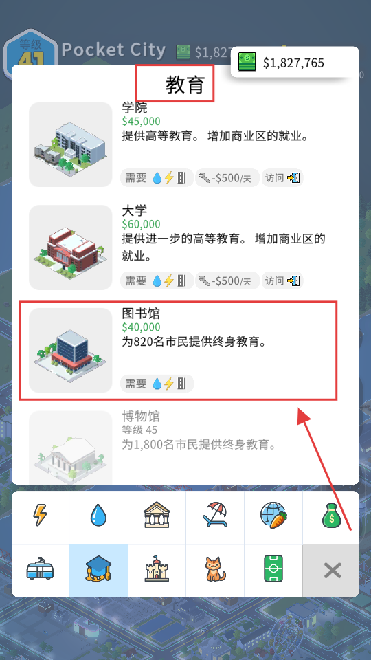 3、在【教育】分类下建造【图书馆】,满足市民的终身教育需求,提升城市吸引力与就业率。