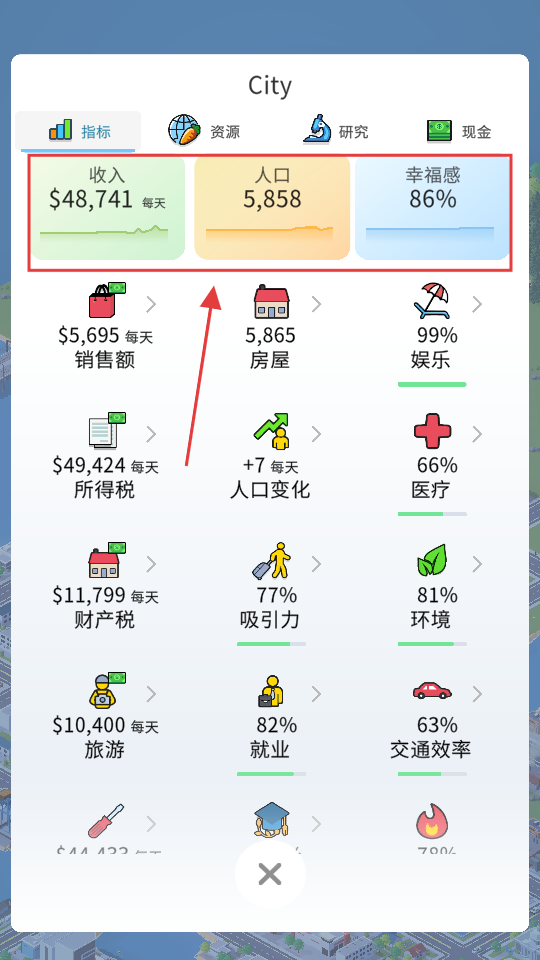 4、查看【指标】界面的【收入】【人口】【幸福感】数据,及时调整城市策略确保健康稳定发展。