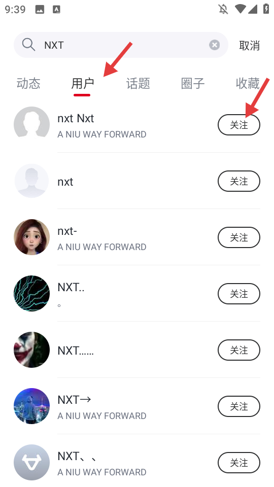 4、在搜索结果的【用户】分类下,找到目标用户后点击右侧【关注】按钮,完成关注操作。
