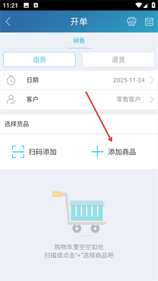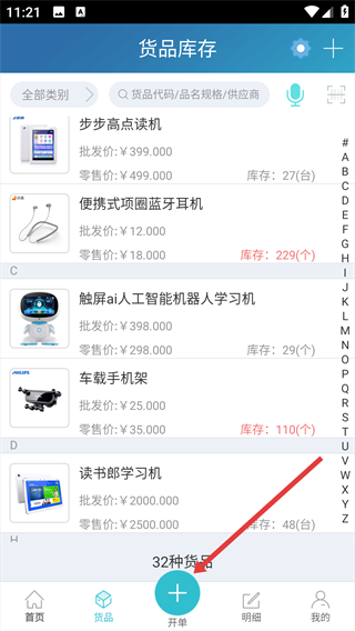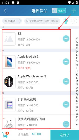 3、选择目标货品,点击右侧的“+”按钮,将货品添加至开单列表。