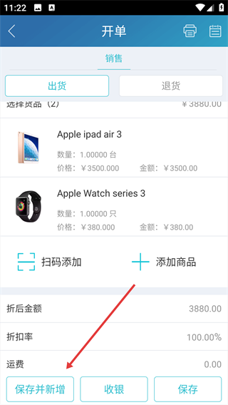 4、商品添加完成后,点击【保存并新增】,完成开单操作。