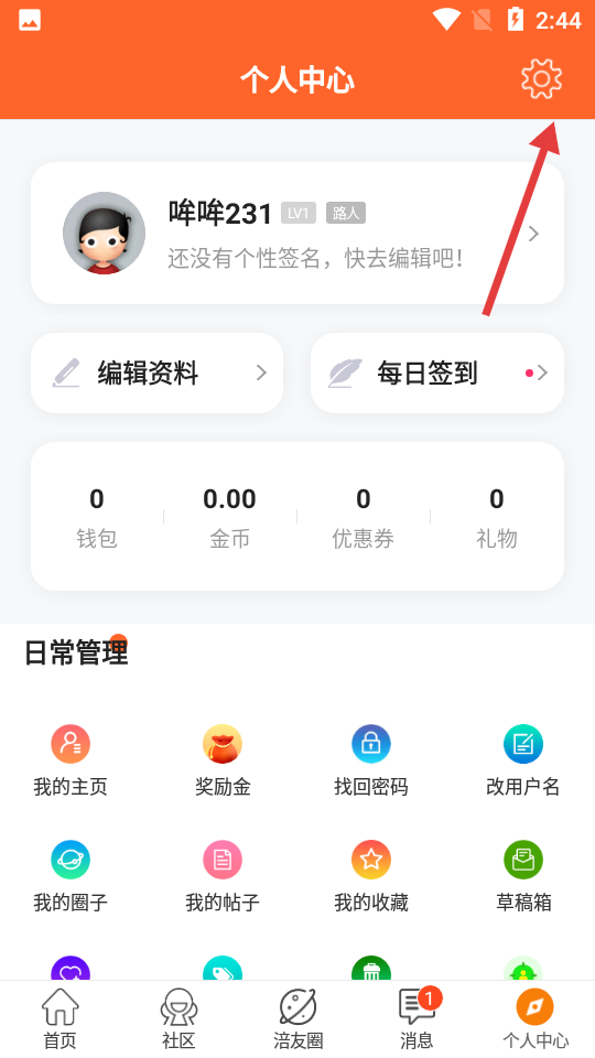 1、在个人中心页面,点击右上角设置图标,进入设置页面。