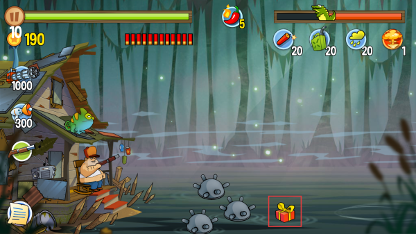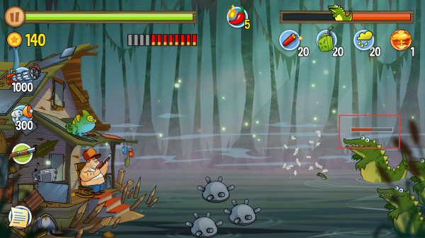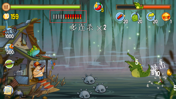 1、控制角色射击鳄鱼,收集资源,提升分数,推进关卡进程。