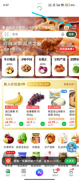 1、我们打开【叮咚买菜】,点击右上角消息图标,这是设置消息提醒的第一步哦。