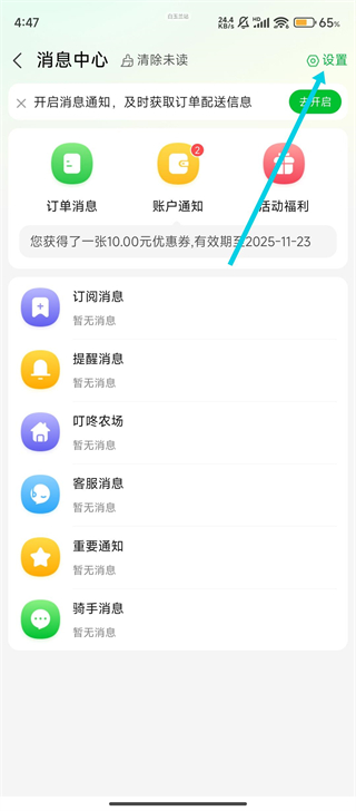 2、在消息中心,点击右上角【设置】,进入消息通知管理页面啦。