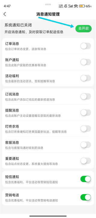 3、在消息通知管理页面,点击【去开启】,就能设置各类消息提醒了哦。