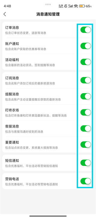 4、我们可以根据需求,开启【订单消息】、【账户通知】等各类消息提醒,及时获取平台信息呢。