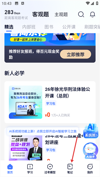 1、在APP首页,点击底部导航栏的“笔记”按钮。