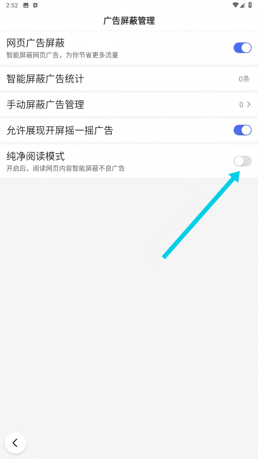 4、之后点击【纯净阅读模式】的开启按钮,就能开启纯净浏览模式,浏览更简洁啦。