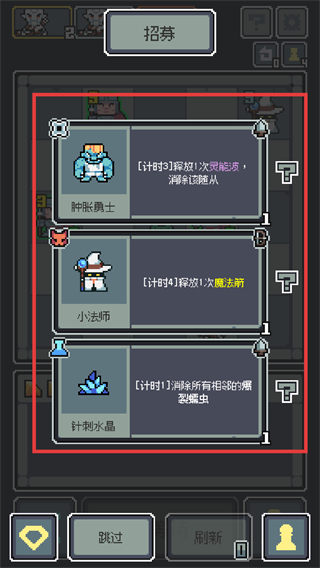 4、招募时优先选技能互补的随从,如【肿胀勇士】-【小法师】,构建强大作战阵容。