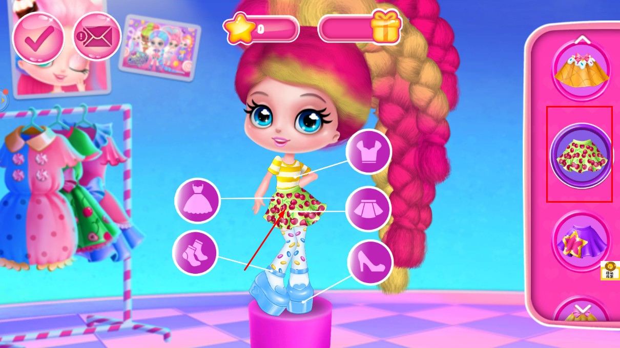 4、接着选择带有樱桃图案的短裙,搭配到角色身上,完成装扮。