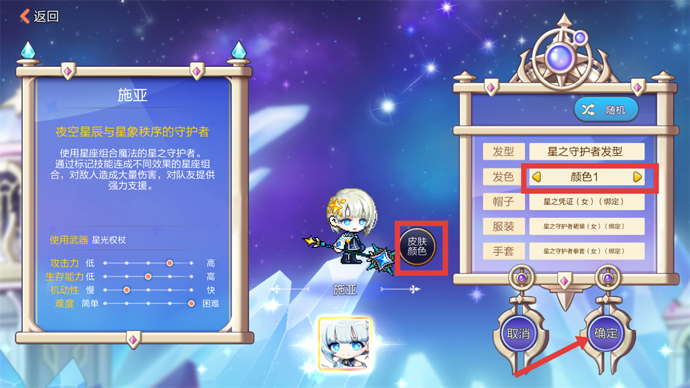 1、创建角色时,可调整发型【颜色】,还可以自定义【皮肤颜色】,点击【确定】就能完成角色定制。