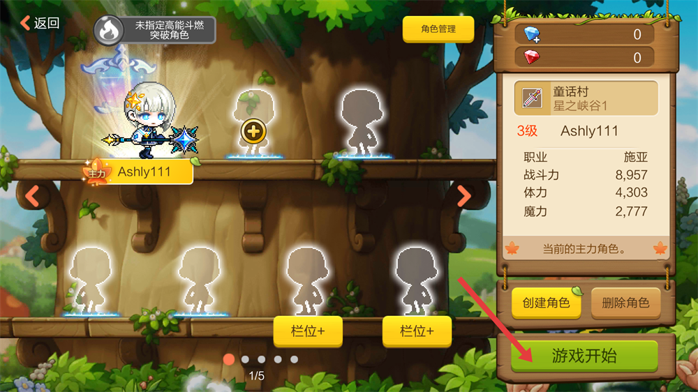 2、确认主力角色的战斗力、体力等信息后,点击【游戏开始】,进入【童话村-星之峡谷1】开启冒险之旅。