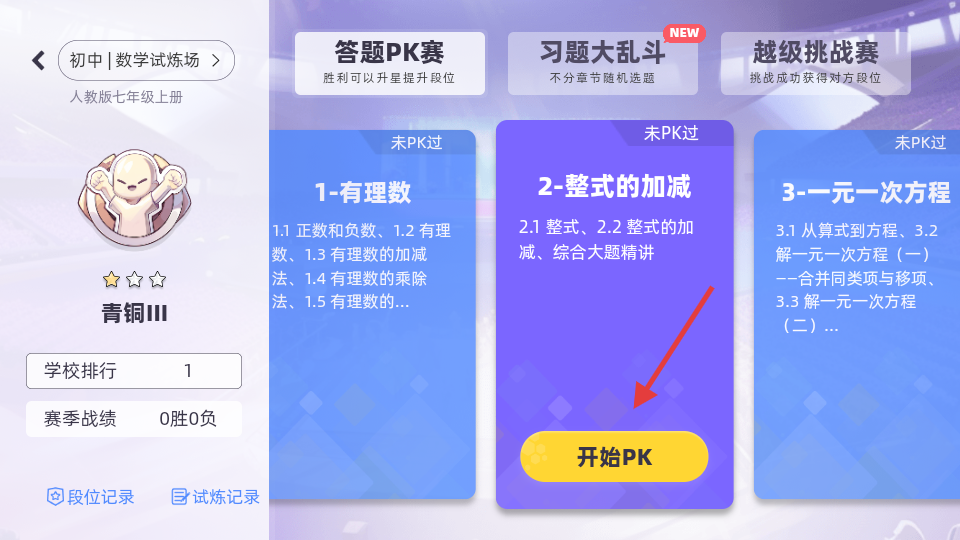 1、进入试炼场,选择目标PK章节,点击【开始PK】。