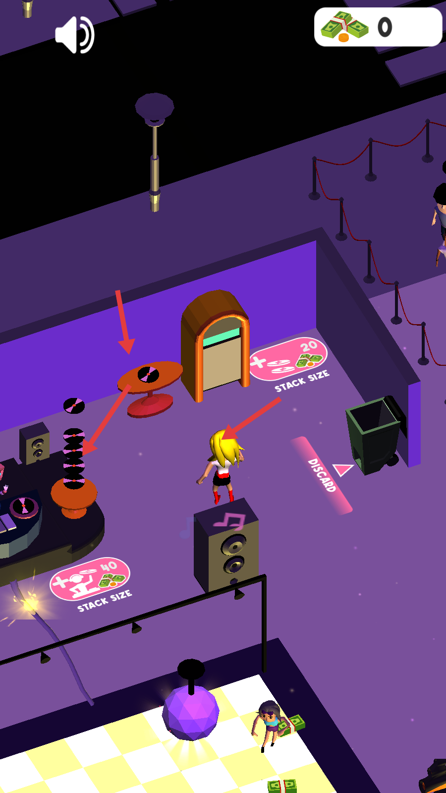 1、操控角色收集红色箭头指向的黑胶唱片,堆叠到指定位置。