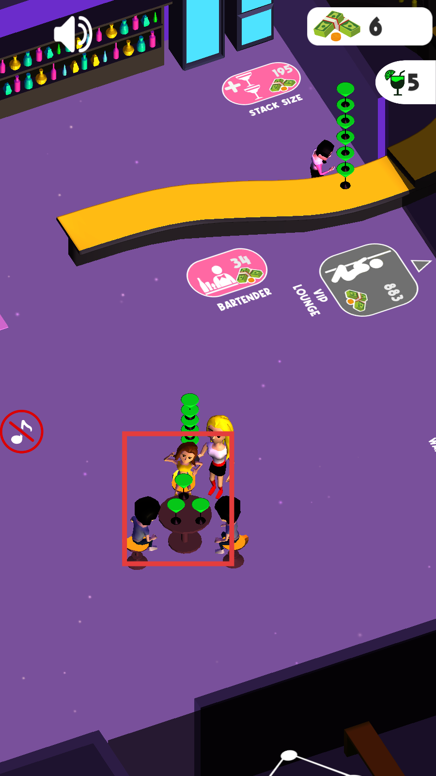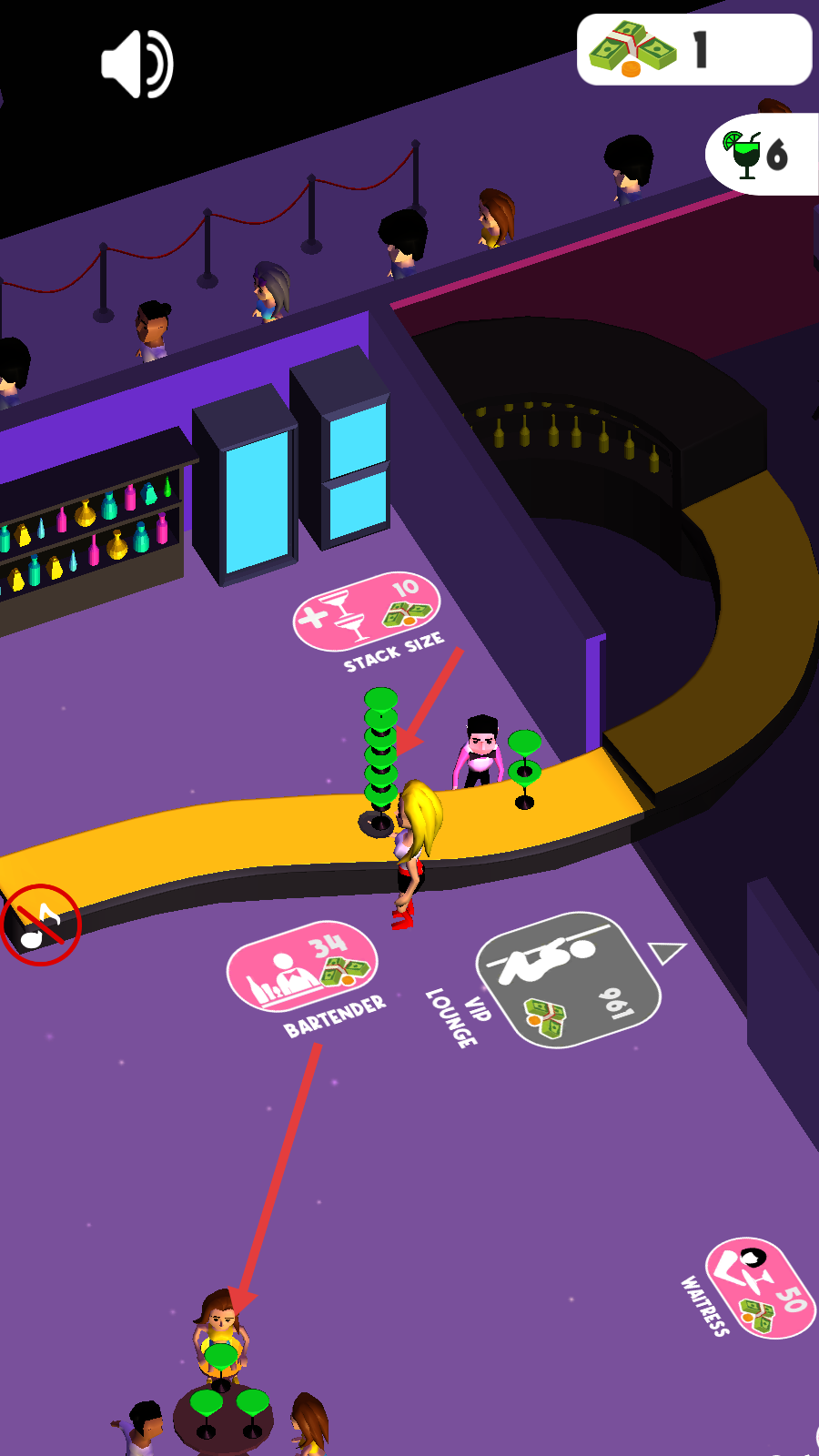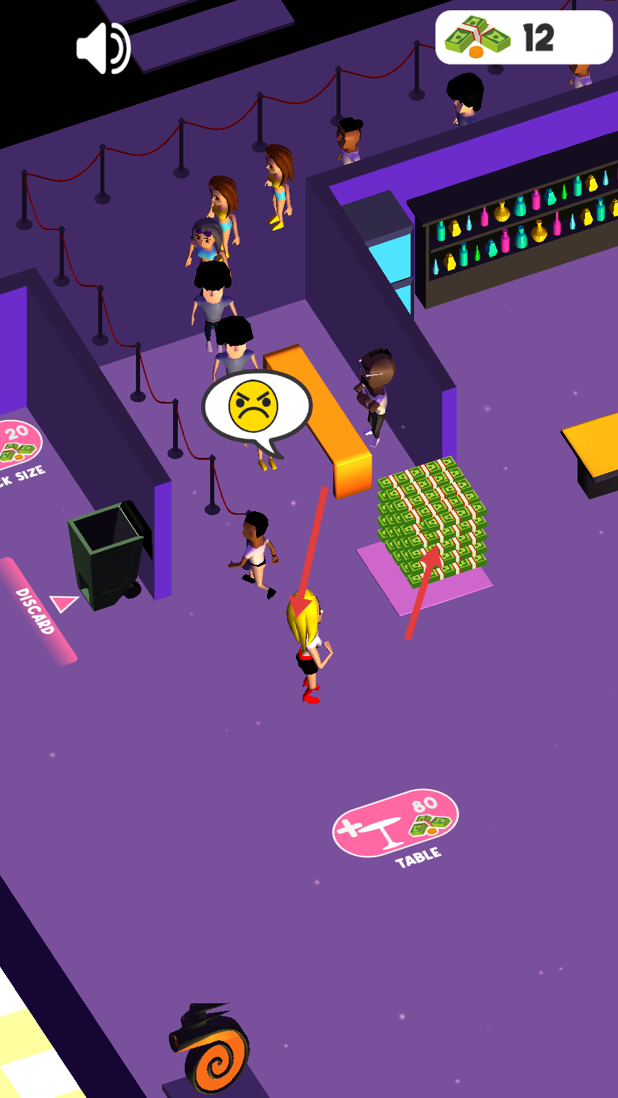 3、将金钱堆叠到指定区域,同时为红色箭头指向的顾客提供饮料服务。