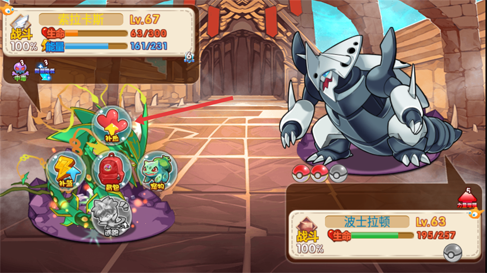1、战斗中若宠物生命过低,点击【补血】按钮,及时恢复生命,保障持续作战能力呀。