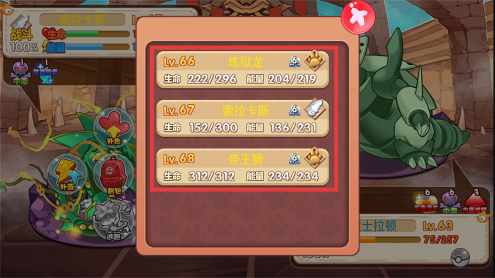 4、根据战局切换宠物,如派出生命和能量满值的【帝王狮】,借助其状态优势,扭转战斗局势呢。