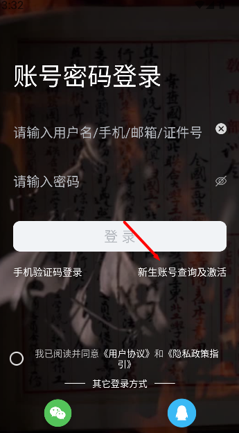 1、进入首页后点击“新生账号查询及激活”,进入账号管理入口。
