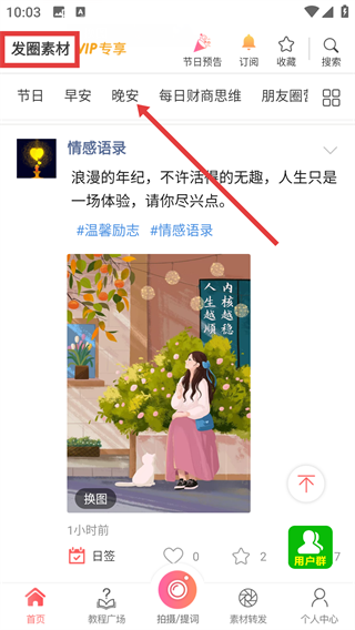 1、打开【微脉水印相机】软件,进入【发圈素材】页面,选择【晚安】分类浏览素材呢。