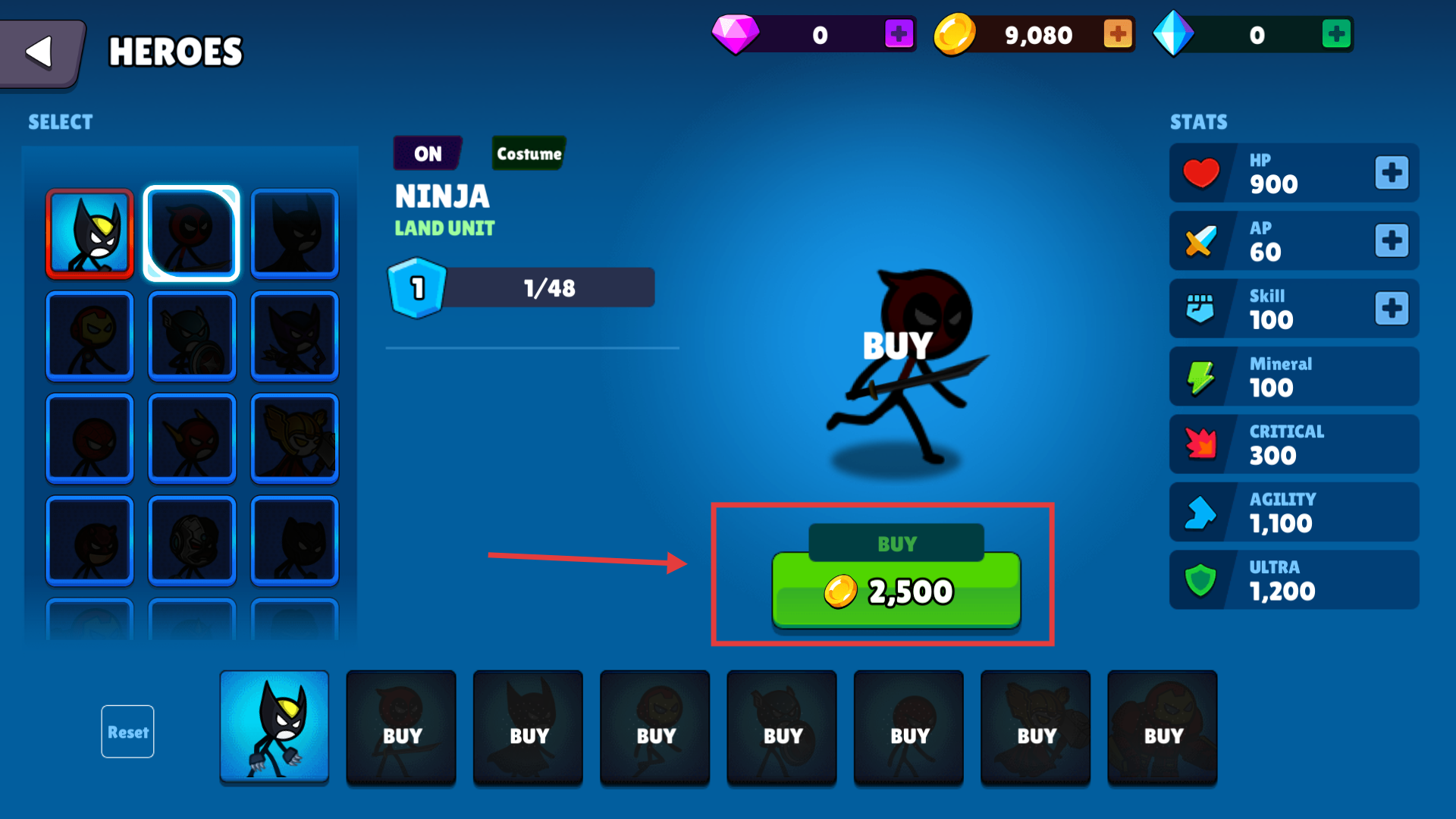 1、在英雄界面点击【BUY】按钮,花费【2500】金币解锁【NINJA】英雄,增强战斗阵容。