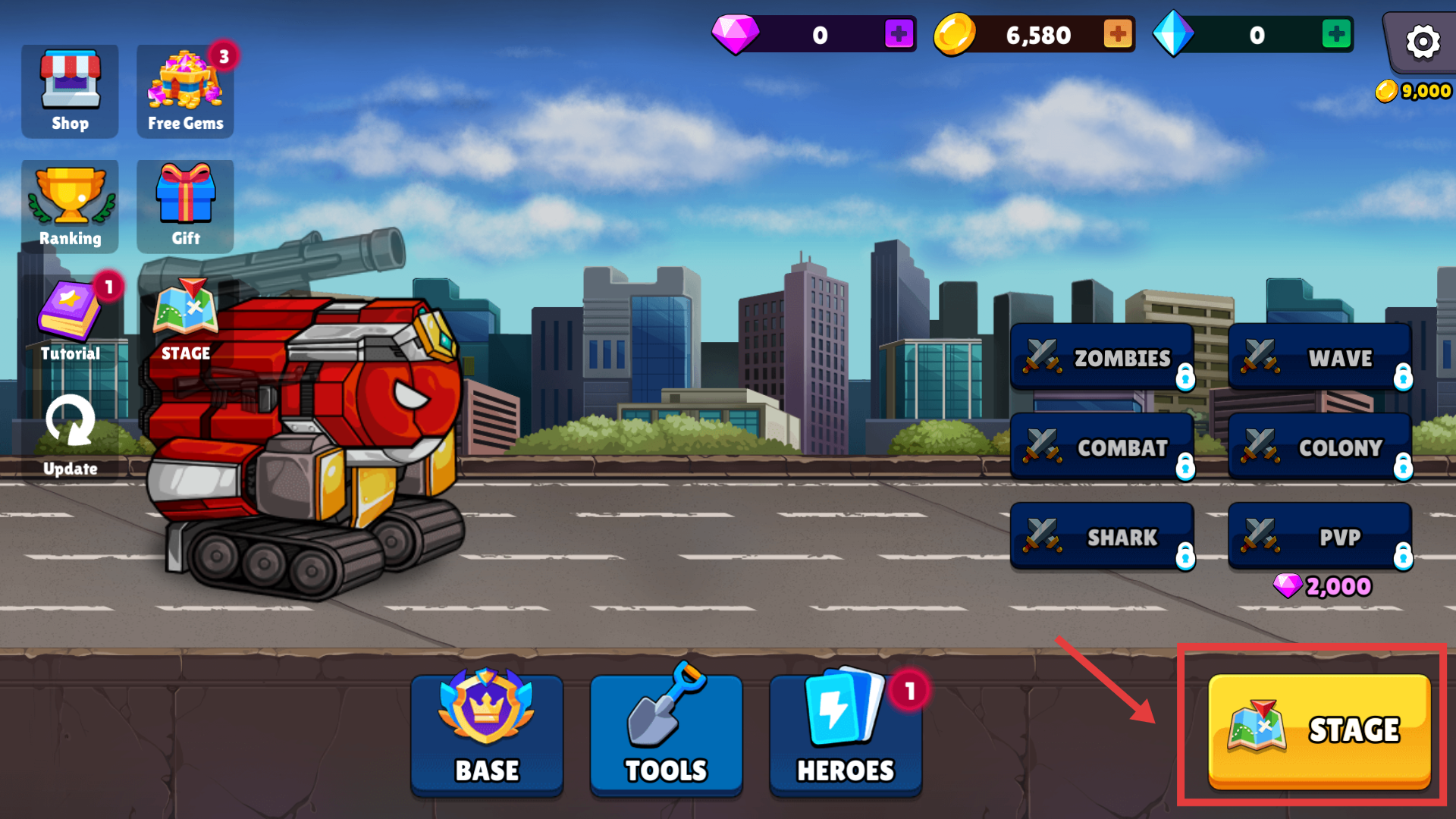 2、点击主界面的【STAGE】按钮进入关卡选择,准备挑战不同类型的敌人波次。