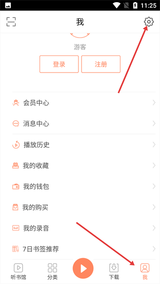 2、来到右下角的“我”界面中,登录自己的账号之后就可以查看到消息中心、播放历史、收藏等内容,接着点击右上角的齿轮图标。