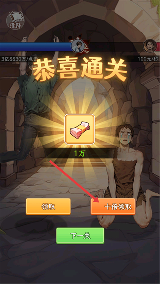 4、通关后获得【1万】奖励,点击【十倍领取】后,再点击【下一关】继续挑战获取更多资源。