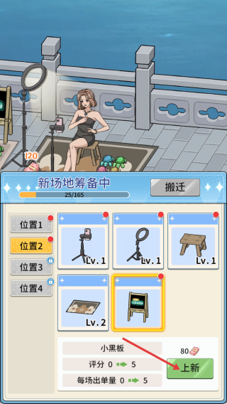 4、在新场地界面点击【上新】布置设备,提升场地评分与每场接单量。