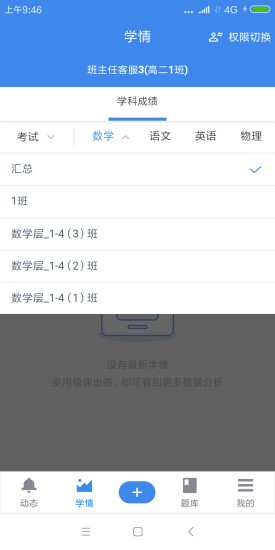 科目全局掌握!包括:成绩趋势、知识点薄弱项和学生分层情况;
