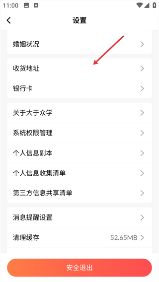 2、进入设置页面,选择“收货地址”选项。