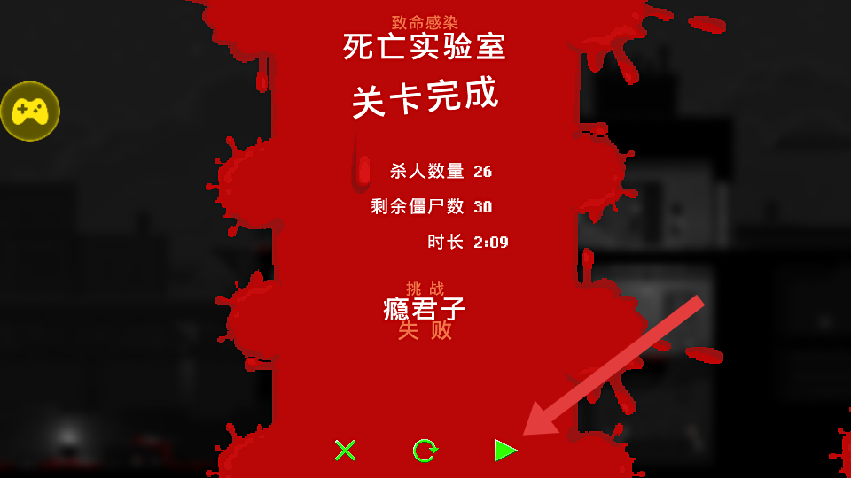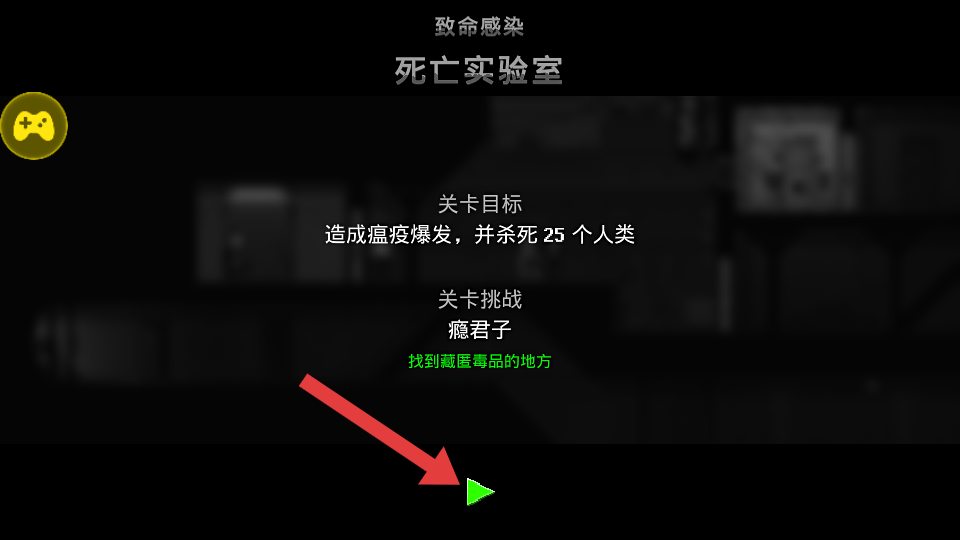 1、在【死亡实验室】关卡界面,明确目标是造成瘟疫爆发并杀死25个人类,点击绿色三角箭头开始挑战。