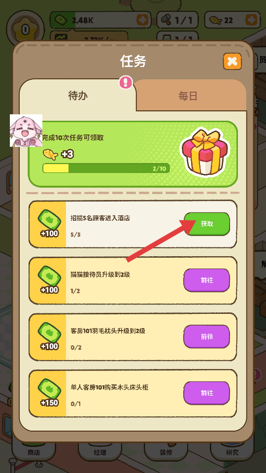 4、完成任务后点击【获取】,领取奖励,积累资源,继续推进酒店建设和任务完成。